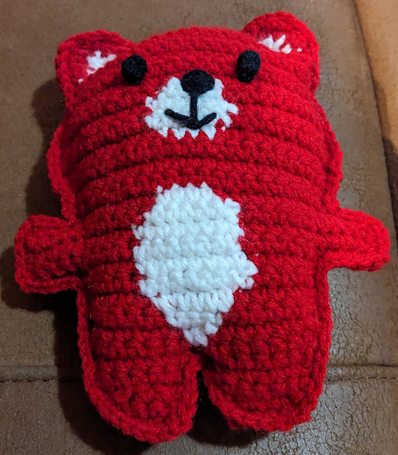 I’m not sure I got the white parts all crocheted just right as it was tricky for me to get the color changes completed evenly. But no worries, I’m sure the child who receives this won’t mind. My pocket bear after stuffing is 7.5 inches tall.